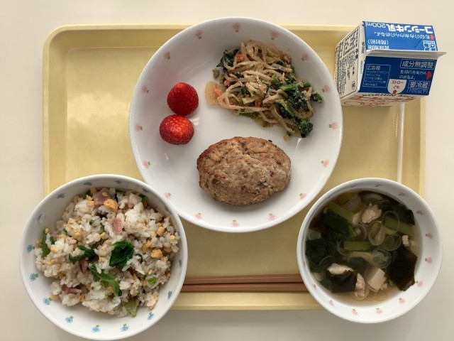 給食では、なばなといり卵で、房総の菜の花畑をイメージした菜の花ごはんを作りました。