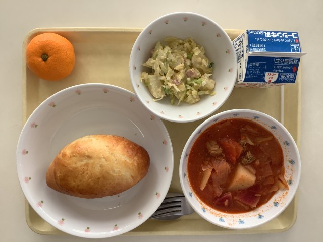 『ピロシキ』は東欧料理の惣菜パンで、日本では揚げたものが主流ですが、ロシアでは焼いたものが主流です。具も多種多様で、肉、魚、卵、米、芋などが用いられます。茶菓子としてジャムや果物を詰めた甘いピロシキも作られています。 今日は給食室で生地から手作りしました。
