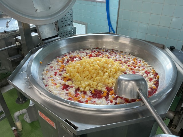 デザートの紅白寒天はクランベリージュースと豆乳を使って作りました。パインやみかん等の果物も加え、色鮮やかな寒天ポンチに仕上がりました。