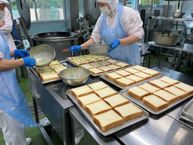 今日のように食パンを使った日には、パン屋さんから届く食パンは、普通の食パンの約3斤分がつながった状態で納品されます。東葛西中では、長い食パンの両端についてくるパンの耳を毎回ラスクにしています。