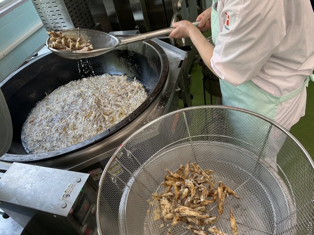 「めひかり」は深い海に住んでいる小魚です。海の中で大きな目がエメラルドグリーンに光ることから「めひかり」と呼ばれるようになりました。 給食では片栗粉をまぶし、油でカリッと揚げます。ふっくらと柔らかい身で、上品な味わいのめひかりは頭からしっぽまで、骨まで丸ごと食べることができます。