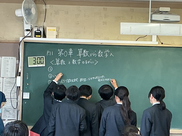 数学では算数と数学の違いについて話し合いました。記号を使う、文字を使う、難しくなる、などそれぞれが違いを見つけていました。「数学」の方がかっこいいよね!という生徒もいました。