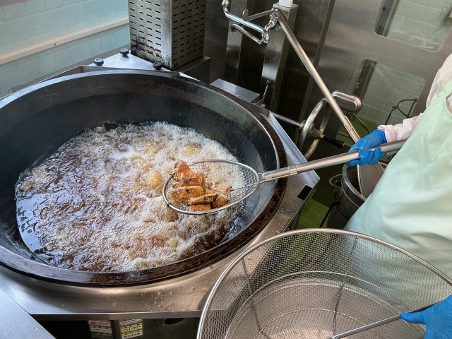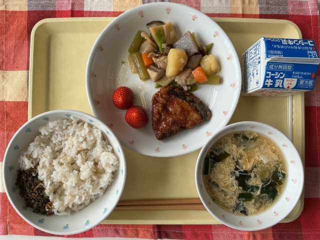 今日の給食では、かつおに生姜・酒で下味をつけ、片栗粉をまぶして油で揚げました。しょうゆ、酒、みりん、砂糖、だし汁、生姜汁で作った甘辛いタレに水溶き片栗粉でとろみをつけ、揚げた魚にからめました。甘辛いタレでごはんがすすむ一品です。
