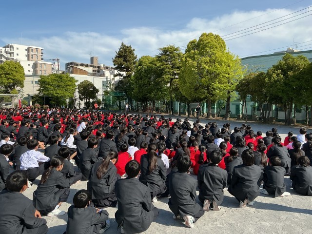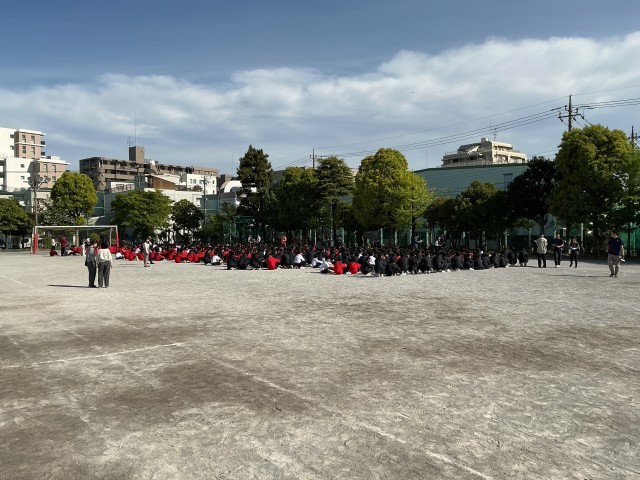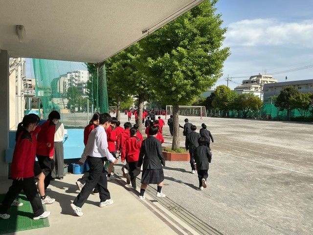 今回の想定は「地震」です。生徒は放送や教育の指示を聞き、落ち着いて校庭へ避難することができました。