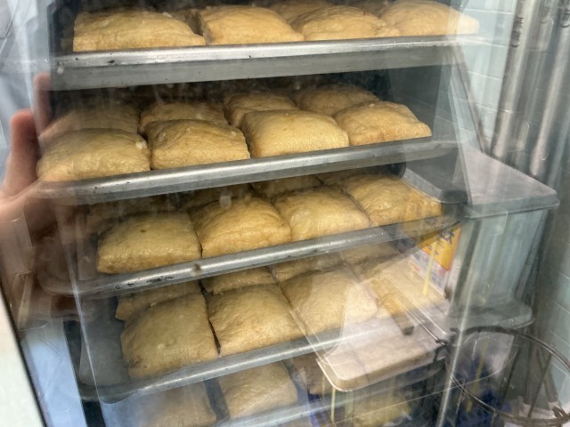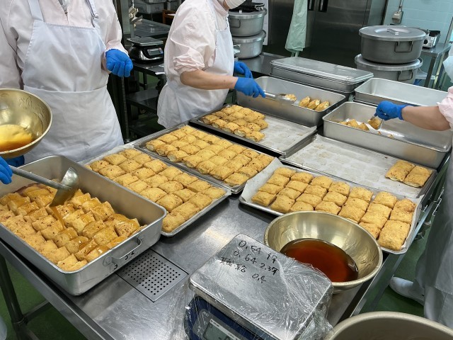 油揚げの中に鶏ひき肉や玉ねぎ、じゃが芋のすりおろし、チーズなどが入っています。学校全体で約750個分の油揚げに1つ1つ調理さんが詰めてくれました。スチームコンベクションオーブンで周りをカリッと焼き上げ、砂糖としょうゆ、みりんで作った甘辛いタレを上からかけていただきます。チーズのコクが美味しさを引き立てています。
