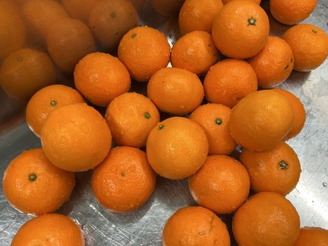 果物は「カラマンダリン」といい、日本の「うんしゅうみかん」とアメリカ生まれの「キングマンダリン」をかけ合わせた品種で、春にみかん感覚で食べることのできる柑橘です。果汁たっぷり、味は濃厚で、糖度が非常に高いのが特徴です。4月から5月中旬にかけて出荷されますが、まだまだ生産量が少なく、希少な品種です。愛媛県が日本一のカラマンダリンの産地です。