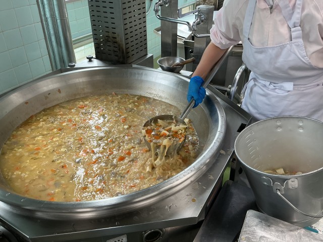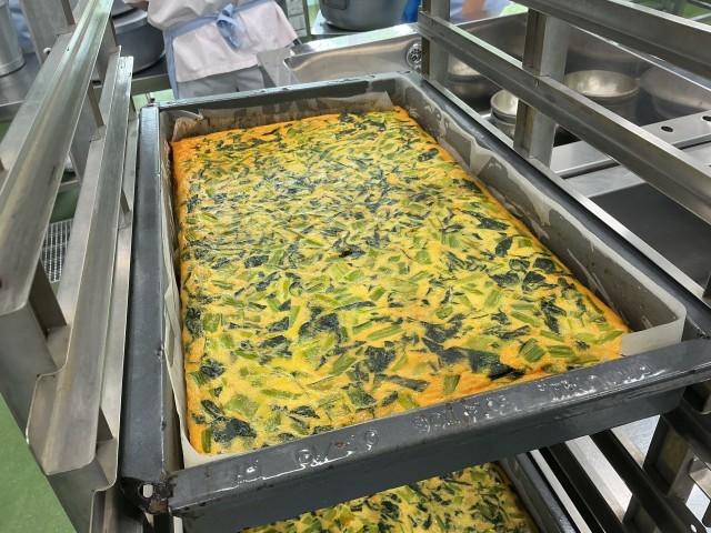 「千草焼き」は、溶き卵に細かく刻んだ複数の材料を加えて、焼きあげた料理のことをいいます。名前の由来は、まるで千種類もの具が入っているかのようにたくさんの具材が入っていることから来ているそうです。給食では鶏ひき肉、玉ねぎ、にんじん、小松菜を入れ、さらにコクを出すためにチーズを入れてアレンジしました。しっとりとした美味しい卵焼きができました。
