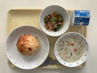献立:ツナときのこのトマトソーススパゲティ、牛乳、ハロウィンサラダ、かぼちゃのスコーン