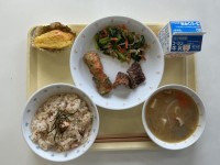 献立:練馬スパゲティ、牛乳、あさりのカリッとサラダ、スイートポテト 又は 小松菜ケーキ