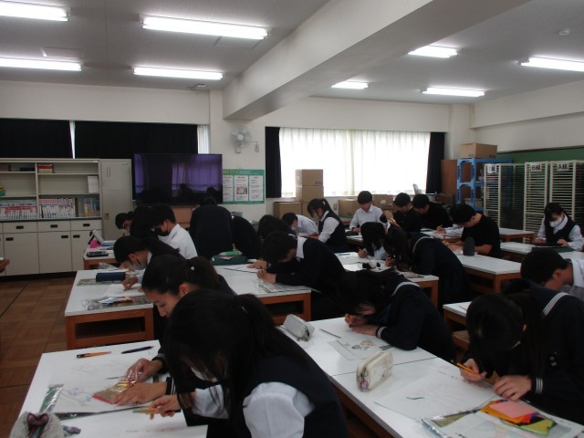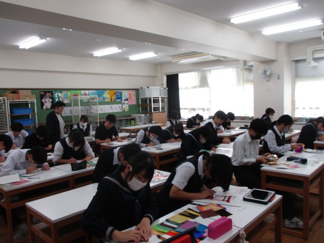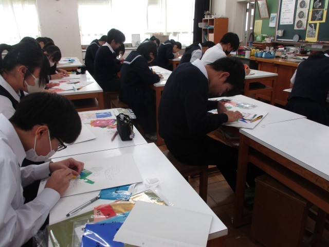 各自が剥離紙のついた制作版にデザイン画を描き、カッターで剥離紙を取り除いたその上に色の紙を貼り付けていき、色彩豊かな日本画風の作品を制作していました。富士山ならば白と青で表すのではなく、固定観念を捨て様々な表現をしている生徒がいました。
