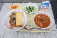 ご飯、サラダ、デザート、すべての料理に小松菜を