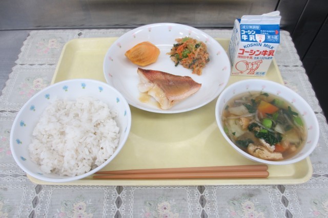 本日のメニュー麦ご飯牛乳赤魚の西京焼きアーモンド和えあんかけ汁柿