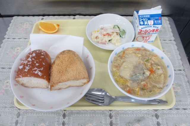 本日のメニュー💮二色揚げパン(砂糖・きな粉) 牛乳 ポテトサラダ 翡翠小松...