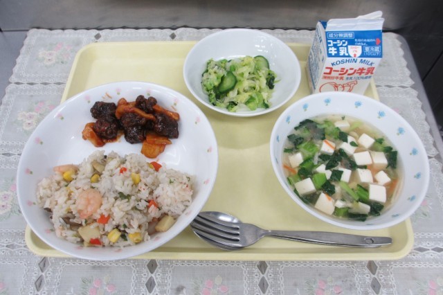 本日のメニュー☆ツナご飯 (新メニュー) 牛乳 レバーの山椒揚げ 海藻のごま酢和...