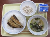 献立はいわしの蒲焼丼、牛乳、具だくさんみそ汁、シュガービーンズです。※試食会を行...