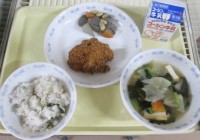 献立はご飯、牛乳、焼きコロッケ、野菜の甘辛和え、大根のみそ汁です。