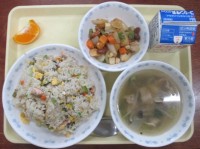 献立は高菜めし、牛乳、きびなごの磯辺揚げ、野菜のおかか炒め、太平燕、みかんです。...