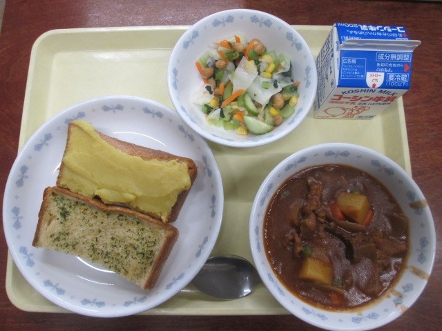 献立はガーリックトースト、スイートポテトトースト、牛乳、いり大豆のフレンチサラダ、ポークシチューです。