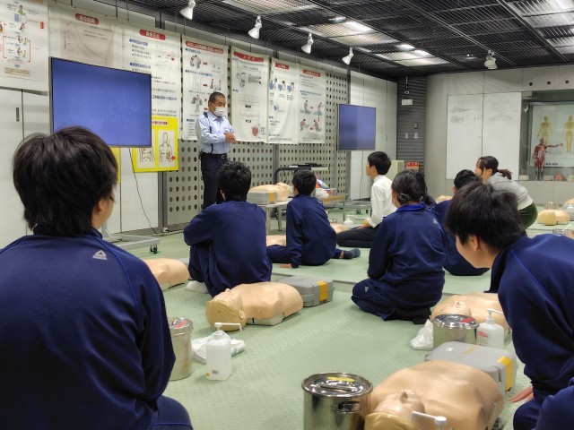校外学習の様子、最後は消火と心臓マッサージの体験です。
