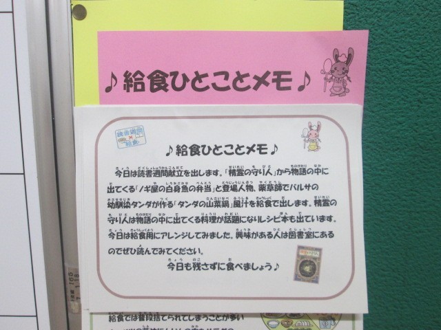 給食では読書週間献立ということで、物語に登場する料理を出します。