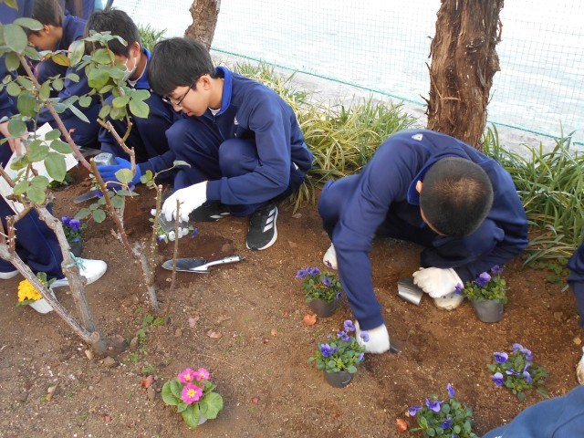 生徒の手により植えられた花の彩でまた一つ明るさを増した