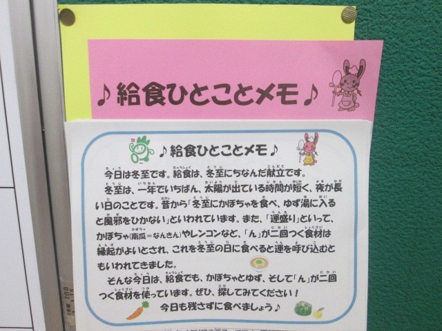 給食では冬至にちなんだ献立を出しました。