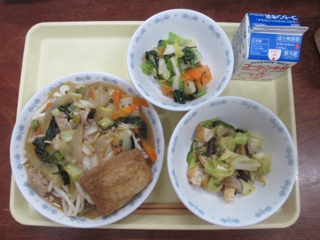 献立は力うどん、牛乳、生揚げとキャベツのみそ炒め、、かぶの塩昆布和えです。