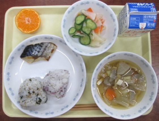献立はおむすび(わかめ、ゆかり)、牛乳、さばの塩焼き、野菜の浅漬け、豚汁です。