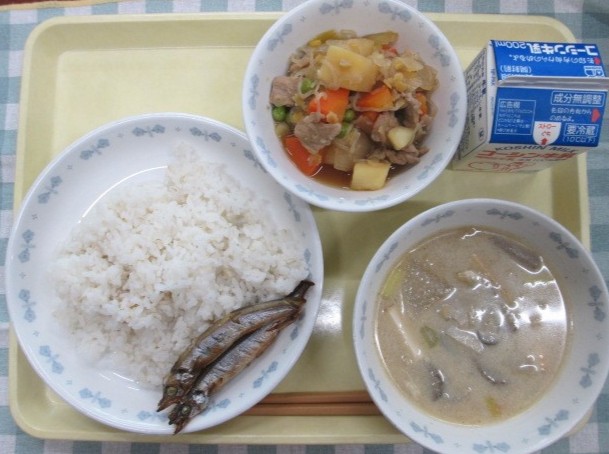献立はご飯、牛乳、焼きししゃも、肉じゃが、根菜の豆乳みそ汁です。