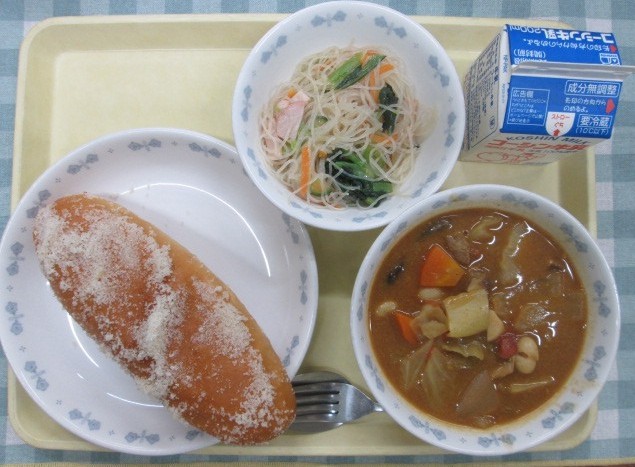献立は揚げパン、牛乳、春雨サラダ、鯨肉入りカレーシチューです。