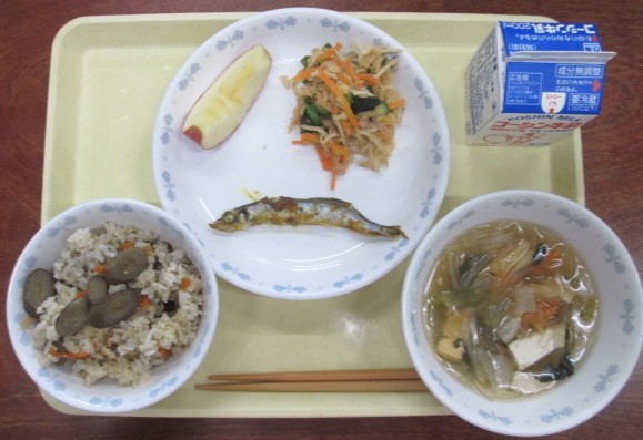 献立はきんぴらご飯、牛乳、シシャモのカレー焼き、切干大根の和え物、くずきり汁、りんごです。