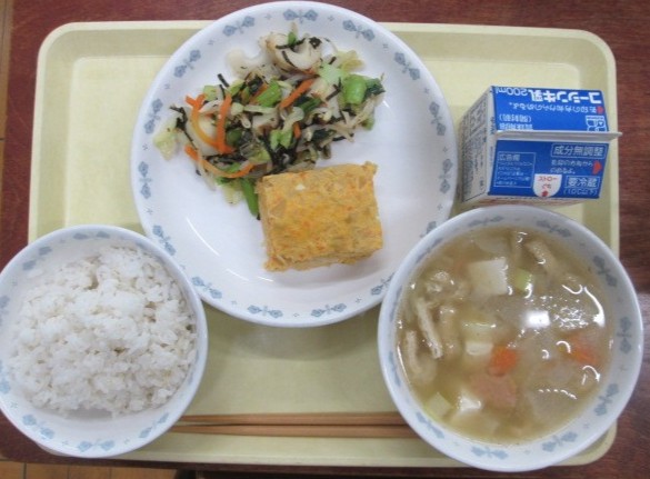 献立はご飯、牛乳、卵焼き、小松菜と竹輪ののり酢和え、かす汁です。