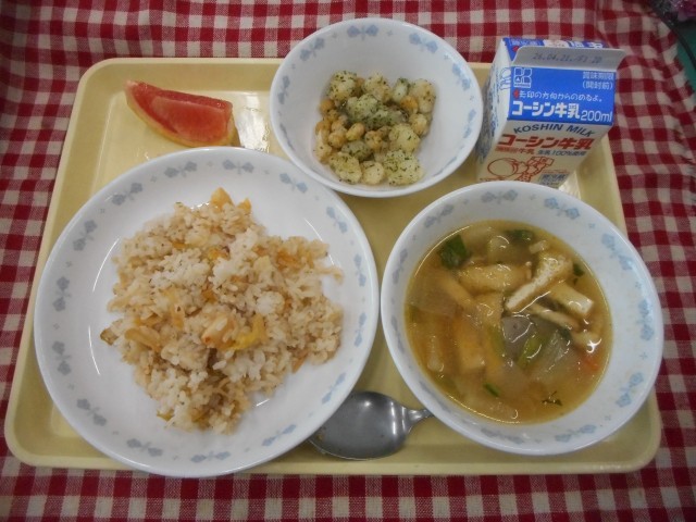 キムタクごはん、タラと大豆の青のり揚げ、とりどり汁、グレープフルーツ、牛乳