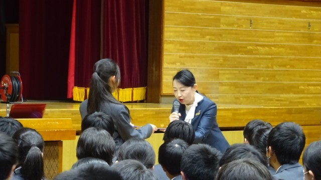 講座では主に、姿勢や挨拶、礼の仕方といった基本動作の大切さについて学びました。第一印象はこうした所作から大きく左右されることを実践を交えて教えていただき、生徒たちも意識を高めて取り組む様子が見られました。、また、「身だしなみ」と「おしゃれ」の違いや、言葉遣いについても、丁寧で相手を思いやる表現が信頼関係の構築につながることを教えていただきました。