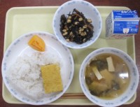 献立はご飯、牛乳、切干大根入り卵焼き、ひじきの煮物、大根とねぎのみそ汁、柿です。...