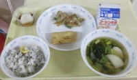 献立は塩昆布ご飯、牛乳、豆腐の真砂揚げ、わかめのレモン醬油和え、豚汁です