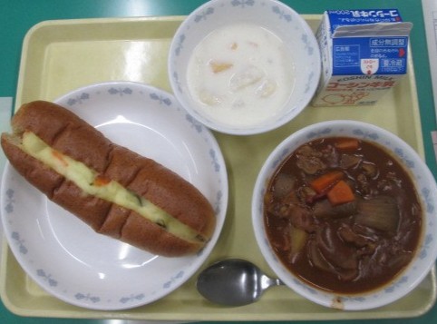 献立は、ポテトサンドパン、牛乳、ポークシチュー、フルーツヨーグルトです。※1年生...