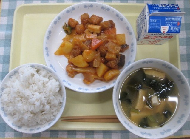 献立はご飯、牛乳、カレー風酢豚、生揚げとわかめの煮干しのみそ汁です。※1年生が家...