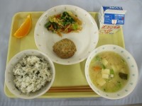 「さつまいもごはん・牛乳・擬製豆腐・小松菜のからし和え・五目汁・巨峰(長野県産)」です。