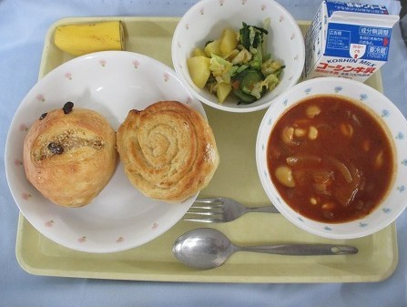 今日の給食はセレクト給食です。手作りレーズンパンか手作りメープルロールパンのどちらかを事前のアンケートで選んでもらいました。手作りレーズンパンを選んだ人は110人、手作りメープルロールパンを選んだ人は340人で、手作りメープルロールパンが人気でした。10月も手作りパンがありますので、楽しみにしていてくださいね。