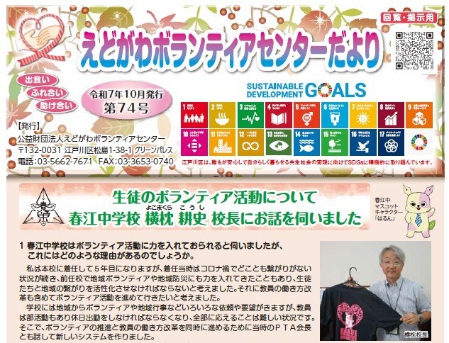 本校では令和4年度から「春江中学校ボランティア」を立ち上げ、中学生と地域が協力して防災訓練を実施するなどの活動を通して、「地域とともにある学校」づくりを進めてきました。町会や自治会等の地域からの要望に応じて、本校生徒へボランティアを募り、地域につなげる取組です。この取組みが「えどがわボランティアセンターだより」へ掲載されました。ぜひご覧ください。また、何かありましたら学校HPにある用紙から申し込みください。