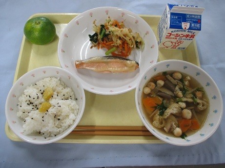 「栗ごはん・鮭の塩こうじ西京みそかけ・キャベツと小松菜のおひたし・のっぺい汁・みかん(熊本県産)・牛乳」です。