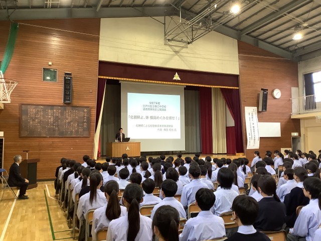 今日は道徳授業地区公開講座として、北朝鮮による拉致被害者家族連絡会の代表である横田拓也さんをお招きしました。拉致被害者について日本政府は17人を認定し、警察庁で拉致の可能性を排除できない行方不明者は871人に上ります。横田さんは、「もし自分だったら」「自分の家族でそういうことが起きたら・・・」誰かの問題ではなく、自分ごとに置き換えて考えてほしい」と生徒へ語りかけました。私たちは、この問題を絶対に風化させてはいけません。私たち一人ひとりの取り組み、思いが必ず拉致問題解決の大きな力となります。拉致問題の1日も早い解決のために、私たちが今できることは何かを改めて考えてみましょう。