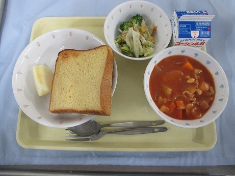 「ヨーグルトトースト・ポークビーンズ・ブロッコリーとベーコンのサラダ・りんご(長野県産)・牛乳」です。