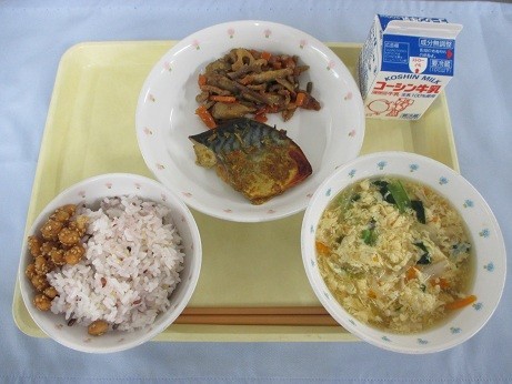 「五穀ごはん・揚げ大豆のごまがらめ・さばのカレーしょうゆ焼き・ごぼうとれんこんのみそ炒め・千切り野菜のかきたま汁・牛乳」です。