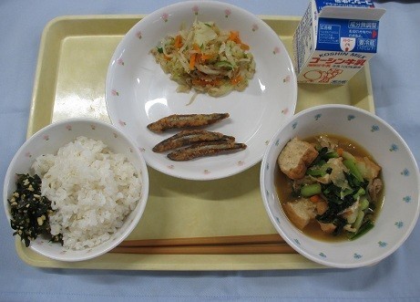 「ごはん・わかめそぼろ・きびなごのからあげ・ハリハリ和え・生揚げの甘辛煮・牛乳」です。