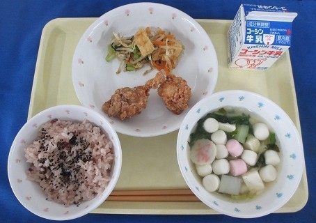 「赤飯・鶏肉のからあげ・もやしと油揚げのおかか和え・祝いなるとのすまし汁・牛乳」です。
