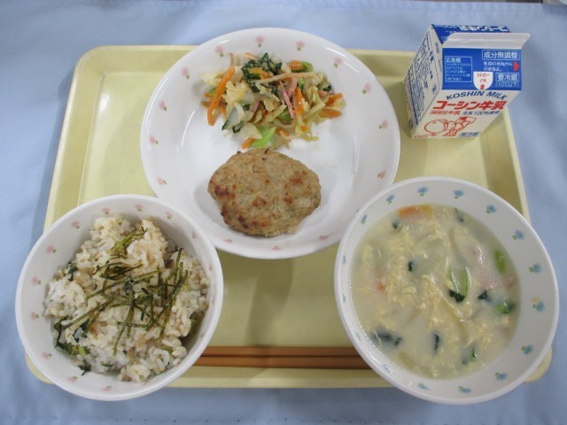 「小松菜ごはん・牛乳・しいたけ入りつくね焼き・小松菜のごま和え・小松菜とベーコンのみそ汁」です。