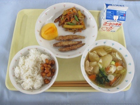 「ごはん・鉄火みそ・わかさぎのから揚げ・さつまいもの五目きんぴら・豆腐すいとん汁・柿・牛乳」です。