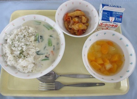 今日の給食は世界の料理で「ジョージア」の料理を紹介します。ジョージアは世界最古のワインの産地といわれ、スパイスやハーブをふんだんに料理に使用するのも特徴の1つです。「世界一にんにくをおいしく食べる料理」とされるシュクメルリは、にんにくとチーズの入ったクリームソースで鶏肉を煮込んだ伝統的な家庭料理になります。オジャクリもジョージアの伝統料理で、じゃがいもと野菜、ベーコンをスパイスで炒めた料理です。給食ではスパイスをたくさん入れずに、食べやすく調味しました。